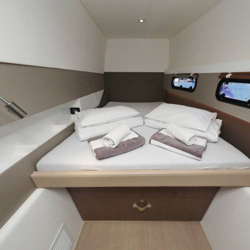 Die Bali 4.3 MY „Sierra“ verfügt über vier Gästekabinen, vier Badezimmer und eine Skipperkabine im Vorschiff. Der Bali 4.3 MY ist der größte und leistungsstärkste Motorkatamaran der Bali-Reihe und verfügt über das Open Space-Konzept mit all seinen Highlights. Das Hauptdeck verfügt über ein einziehbares Schott, das den Salon und das Achterdeck nahtlos verbindet und teilweise von der Flybridge-Verlängerung beschattet wird. Der Salon hat einen Panoramablick, der Sie und Ihre Gäste verwöhnen wird, und das solide Vorderdeck hat ein riesiges Sonnendeck, zwei Tische und ein Sofa, das Platz für die gesamte Besatzung bietet. Die Flybridge bietet auch viel Wohnraum, darunter einen zweiten Steuerstand, optional zwei Tische, eine Sonnenlounge und viele Sitzgelegenheiten. Der Katamaran wird von 2 x 250 PS Yanmar 4-Zylinder-Dieselmotoren angetrieben und ist wellengetrieben und erreicht bis zu 24 Knoten. Die Kraftstofftanks fassen bis zu 1.600 Liter.