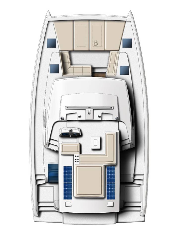 Luxuriöses Flybridge: Ausgestattet mit Sonnenliegen, einem Tisch und einem Kühlschrank, bietet das Flybridge auf der Bali 4.6 eine Rundumsicht von 360 Grad und ist der ideale Ort zum Sonnenbaden oder für den Panoramablick.