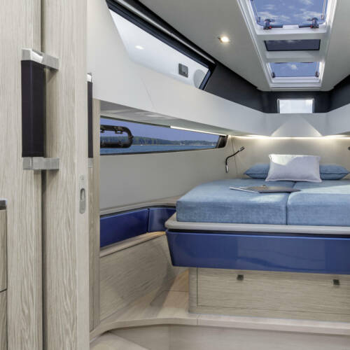 Thanks to the new hull with higher freeboard, there is significantly more volume in the interior to maximize comfort and the sense of space. Fjord 41XL features the largest in-class hull windows, which provide plenty of light and complement the iconic design, crowned by the mighty T-top. Sturdy roof pillars are integrated into the bulwarks to complete the design-optimized interaction of hull, superstructure, and helm station. In addition to maximum stability, this also guarantees the greatest possible ease of movement on deck. Truly a spectacular and unprecedented yacht that offers a total of 90 possible combinations, Fjord 41XL can be adapted to all individual wishes.